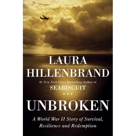 I finally decided to attach this 500 pager after New Years and I could not put it down. It took me 3 weeks to read, which may sound long to my friend Kat, but is light speed for me in a Nonfiction novel. Unbroken moves incredibly fast and keeps you dying to turn more pages and hear what will happen to Louis Zamperini next. From the very beginning, you are plopped in the middle of his true story, where Louie and friends are stranded on a raft at sea fighting off sharks and Japanese fighter pilots. Then you jump back to Louie’s childhood and follow his epic journey through school, running, the Olympics, Air Force training, combat bombardier-ing, planes going down, rafts coming up, life at sea, life in internment camps, life in POW camps, life after the war, depression, resilience, religion, recovery, and finally … today.