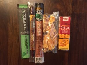 Lunch 1: Beef Stick Snack. Packaged meat, cheese, and carbs – everyone’s favorite lunchtime treat. For this meal plan, we go with three 1 oz packaged beef sticks (after sampling a few, I like Wyoming Gourmet). Add to this 1 package of Market Pantry Cheese Sandwich Crackers and 1/2 package of Trader Joes Soft and Juicy Mandarins. When it comes to dried fruit, it doesn’t get better than TJ’s, though I prefer the fruits without added sugar.
